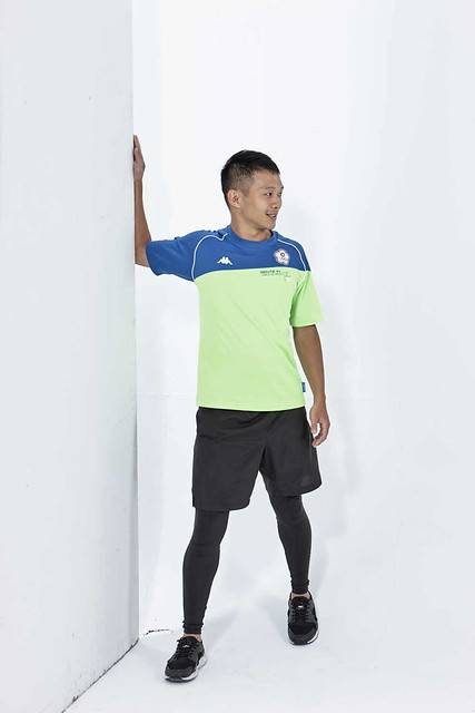 單手上舉且手肘彎曲90度,將手靠在牆壁上,保持手臂到肩膀為一直線。