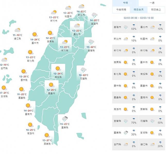 週二、週三東北季風報到,迎風面北部、東半部轉為濕冷,降雨機率提高,尤其週三東北部要留意有局部較大雨勢發生,中南部山區也會有零星雨勢;預報員李孟軒表示,受降雨影響,各地氣溫下滑,低溫約13到15度,北部、東北部白天高溫約16到19度。至於中南部地區則影響不大,但要留意日夜溫差較大,溫差可達10度。