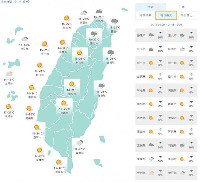 〔即時新聞/綜合報導〕明(15)日冷氣團減弱,白天溫度回升,不過迎風面水氣仍多,東北部、基隆北海岸地區有可能發生局部大雨,提醒民眾視天氣變化攜帶雨具。