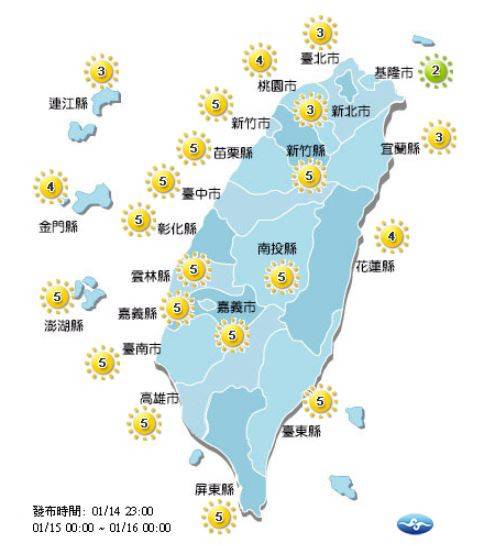 紫外線方面,明天基隆市為綠色「低量級」,其他地區皆為黃色「中量級」。