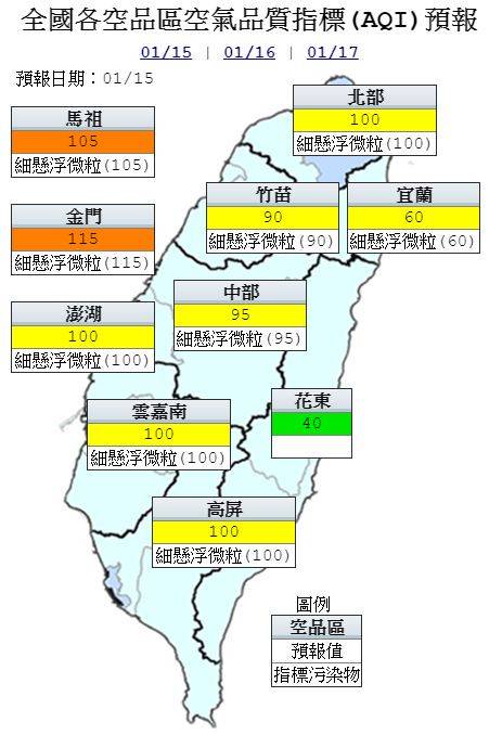空品方面,明天花東地區為「良好」等級;北部、竹苗、中部、雲嘉南、高屏、宜蘭以及澎湖地區為「普通」等級;、馬祖、金門地區則為「橘色提醒」等級。