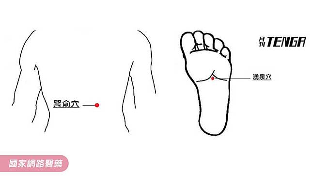 取穴:湧泉穴,是人體足少陰腎經非常重要的穴位,位於腳底中線前三分之一交點處,當腳屈趾時,腳底前凹陷處。腎俞穴,位在腰背部,第二腰椎下旁開1.5寸,和前面的肚臍眼平齊正好是第二腰椎(督脈的命門穴)。