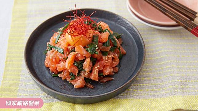 3.將韭菜燙好,過冰水後瀝乾,再拌入鮭魚。盛盤後,放入生雞蛋黃,再撒上芝麻、辣椒絲即完成。