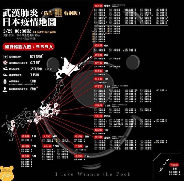 〔即時新聞/綜合報導〕武漢肺炎疫情延燒,日本目前確診946例、11例死亡(含鑽石公主號705例、6例),就有熱心網友在日本打工社團分享疫情地圖總整理,沒想到卻有中國五毛將此修改成台灣版的疫情地圖進行造謠,作者得知消息後則做出「防盜特別版」,在疫情地圖加上小熊維尼的浮水印,藉此讓五毛退散,許多網友見狀也紛紛大讚。