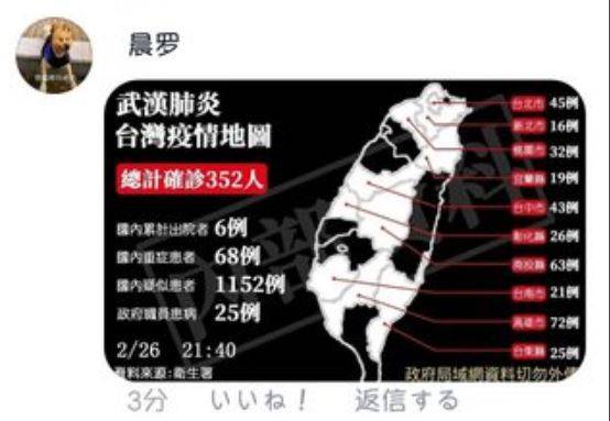 有網友在PTT貼出日本武漢肺炎疫情地圖,表示該疫情地圖是由一名熱心網友「siba Chen」繪製,並在日本打工社團分享給其他網友參考,沒想到該疫情地圖卻被中國五毛盜用抄襲,將此修改成台灣版的疫情地圖進行造謠,散播假消息指稱台灣確診達352人。