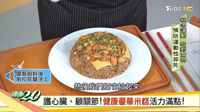 國宴御廚雷議宗介紹這道「一食兩吃」料理──健康豪華米糕、健康豪華飯糰。大部分的米糕都是以糯米製作,但雷師傅改用薏仁等五穀雜糧作為米糕的基底,搭配富含蛋白質的食材,做出這道適合運動後補充營養的高CP值料理。