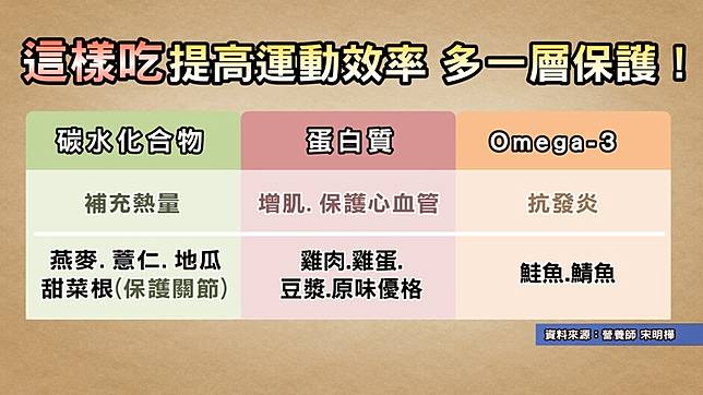 運動前需要吃點東西、補充體力,那麼運動後呢?營養師宋明樺說:「運動後也要!」她建議,在運動後1小時內進食,包括蛋白質和碳水化合物,以補充運動過程中大量耗損的肝醣和蛋白質。