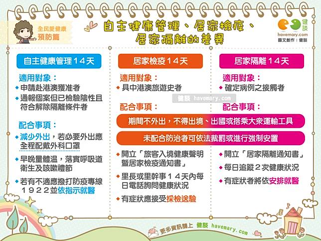 1. 需配合自主健康管理14天,期間應避免外出,如因必要外出時應全程配戴外科口罩。