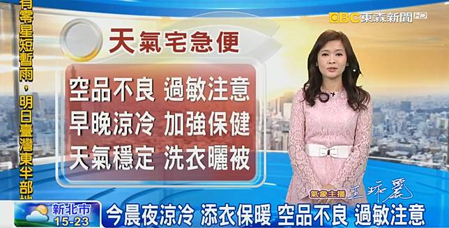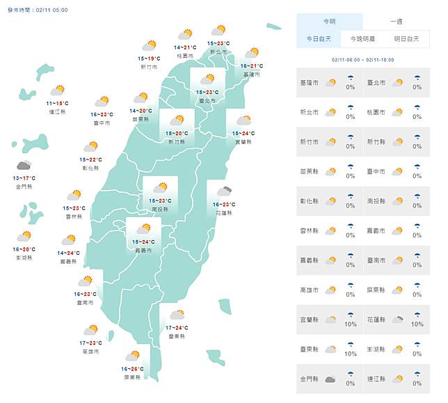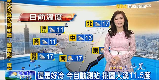 中央氣象局表示,今日大陸冷氣團減弱,台灣各地大多為多雲到晴,僅東部、東南部地區有零星短暫雨,天氣持續回暖,不過清晨還是比較冷,中部以北低溫大約只有14度左右,其他地區15到17度,白天北部及東半部高溫可達到23、24度,中南部則約25、26度,日夜溫差較大,早出晚歸的朋友應留意溫度變化,適時添加衣物以免受涼。