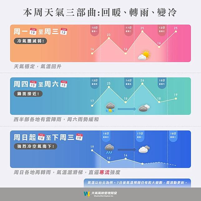 天氣風險公司也在臉書PO出一張圖,指出本周天氣可以分為3部曲:回暖、轉雨、變冷,周一至周三:持續回暖、天氣大致穩定;周四至周六:鋒面接近有雷陣雨,周六雨緩;周日至下周二:強冷空氣壓境,大幅轉冷,也提醒冬天還沒結束,要隨時注意天氣變化。