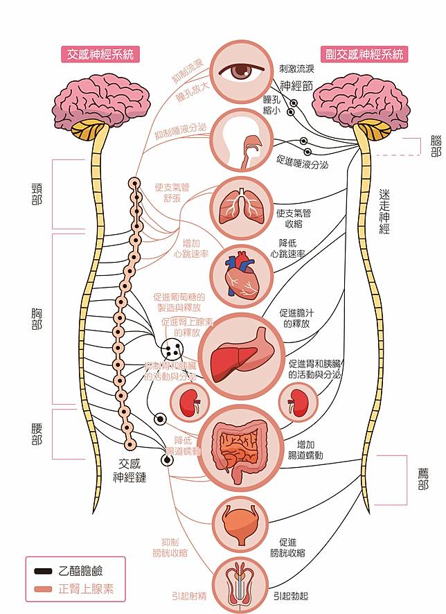 自律神經系統從我們出生開始就不停的運作,它幾乎影響我們身體的所有狀況。人體的自律神經分為兩大系統,一個是交感神經,另一邊是副交感神經,二者的作用通常是相反的,或稱之為拮抗,但也有互相幫忙的。用汽車來舉例,簡單來說它們兩個一個負責踩油門,另一個負責踩煞車。