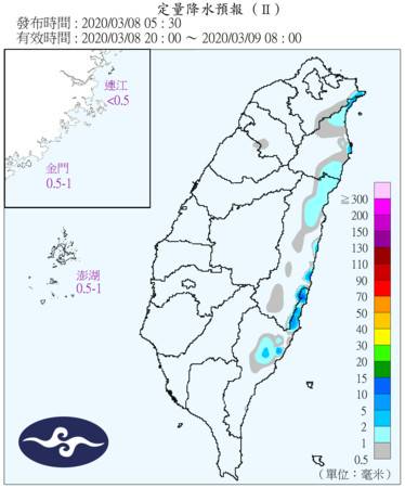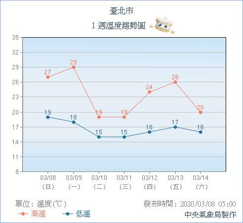 氣象局提醒,周二鋒面通過及東北季風增強,這道鋒面結構完整,全台各地有局部短暫陣雨或雷雨,其中在中部以北及宜蘭、花蓮雨勢較明顯,有局部大雨發生的機率,北台灣在鋒面通過後氣溫將明顯下降。根據氣象局預報,估台北周一高溫有29度,周二僅剩19度,降幅高達10度。