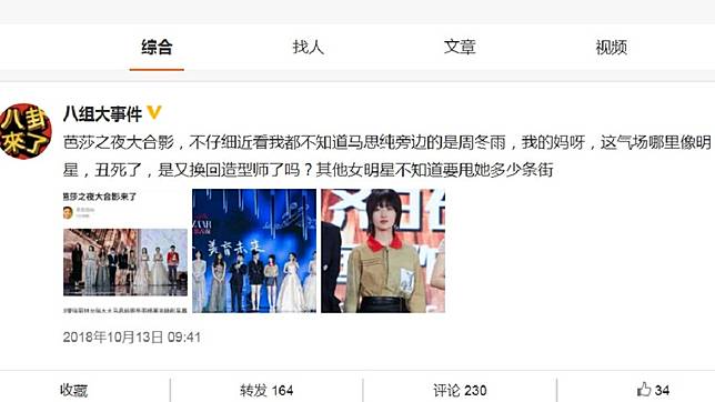 大陸女星周冬雨13日出席活動時,曾被網友嘲諷「換造型師」、「醜死了」,並指她沒有明星氣場。25日周冬雨的新片上映,粉絲才發現她在戲中為了角色剃成大平頭,紛紛稱讚她非常能忍耐,為保密竟戴了大半年的假髮,讚她是「超敬業影后」。