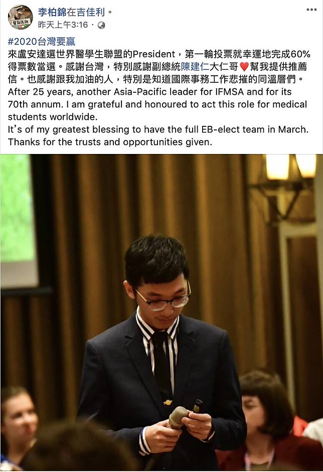 台灣在外界打壓下,無法順利加入世界衛生組織(WHO),不過台灣醫學界學生依舊在國際上闖出一片天,成功大學醫學系李柏錦在競爭激烈的同儕中脫穎而出,高票當選第70屆「世界醫學生聯盟」(IFMSA)會長。