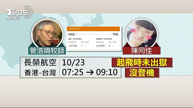 23日早上七點二十五分,從香港起飛,牧師管浩鳴幫忙購買的,就是這一班,選擇台籍的長榮航空,抵台時間,應該是早上九點十分,但當時陳同佳根本還沒出獄,才沒順利登機,牧師管浩鳴協助陳同佳來台受審,動作頻頻,傳出早在上個月,還來找委任律師。