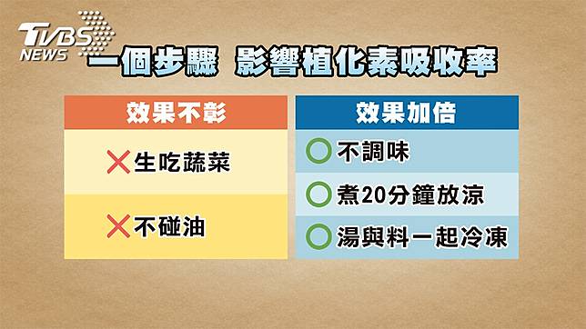 想要冬季防癌,「防癌蔬菜湯」是最不會造成身體負擔的養生法。蔬果裡頭的植化素與膳食纖維,具有強大的抗氧化力,對於預防癌症有很大的助益。蔬果中的膳食纖維,可幫忙吸附毒素,刺激腸壁蠕動,使大便通暢不滯留在大腸,將毒素清除乾淨不易罹癌。另外,安南醫院醫療副院長許秉毅表示,植物長時間在戶外,受到陽光紫外線的刺激,為了避免傷害,會自行製造出自我防禦的成分,這就是所謂的「植化素」,存在於蔬果的細胞當中,這些細胞被由纖維素所製造的堅固細胞壁包覆著。因為人體無法消化纖維素,所以必須透過熬煮蔬菜的方式,將堅固的細胞壁輕易破壞,才能使抗氧化物質的植化素溶解在湯裡。營養師宋明樺提醒,部分植化素像是葉黃素、β胡蘿蔔素、玉米黃素,由於屬於油溶性,需要加點油,才能幫助吸收。