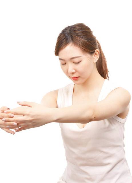 ▼坐在椅子上雙手伸到胸前將雙手握住。
