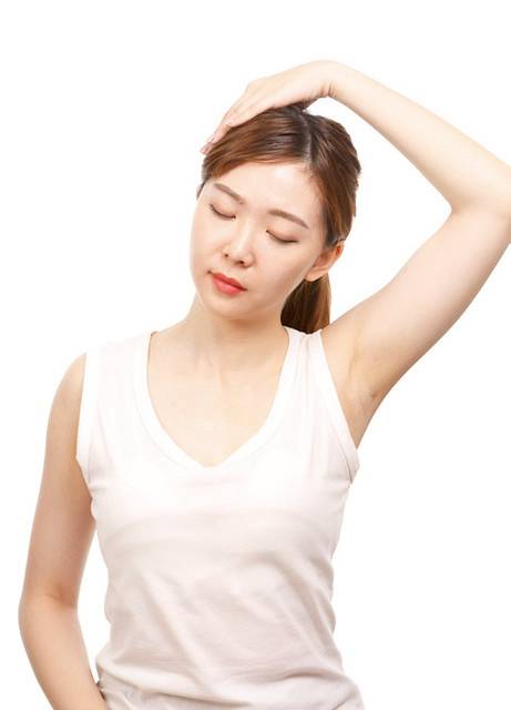▼將左手舉起跨過頭頂放在頭頂右側,並將頭部與頸部緩緩倒向左側;反過來做一樣的動作。