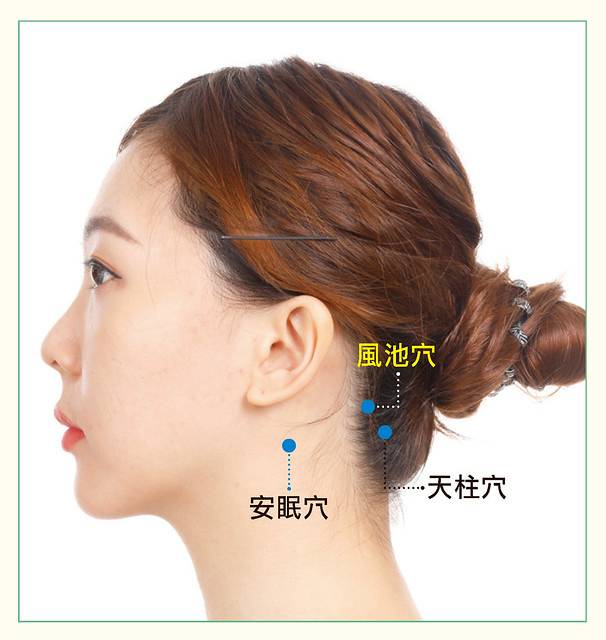 按摩頸部兩側髮際線肌肉外側上(在天柱穴再往外約1公分處)的風池穴,可以緩解頭重不適感及失眠症狀。