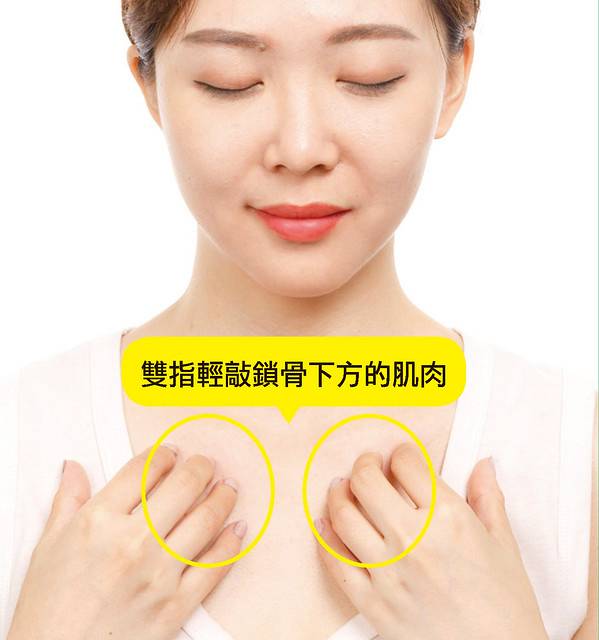 不論是坐在床上或是橫躺在床上都可以簡單地按摩此處,讓人可以順利地「深呼吸」來幫助入眠。將左右雙手各自放在鎖骨下方處,用拇指以外的四隻手指指尖左右交互輕敲即可。