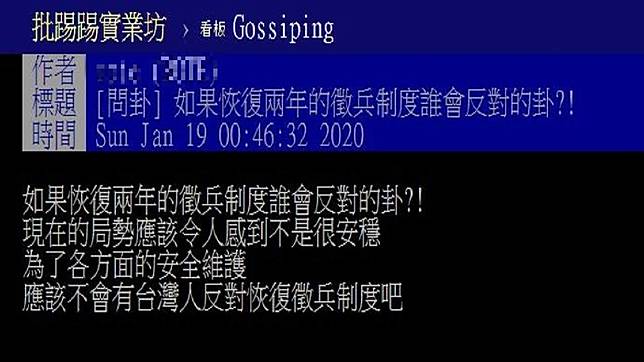 有網友在PTT的八卦版發文詢問「如果恢復兩年徵兵制對國家有幫助嗎?」網友表示「現在的局勢應該令人感到不是很安穩,為了各方面的安全維護,應該不會有台灣人反對恢復徵兵制度吧?」