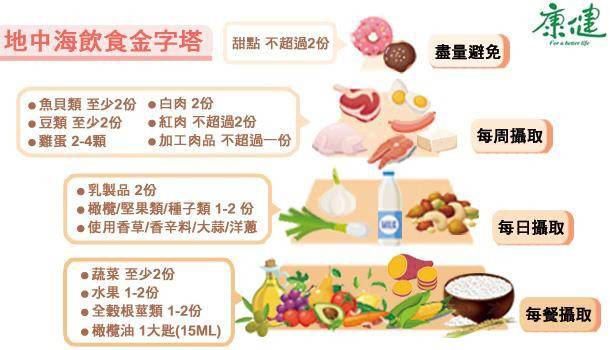 (地中海飲食基金會(Mediterranean Diet Foundation, MDF)公布的飲食金字塔。圖片來源:葉懿德製圖)