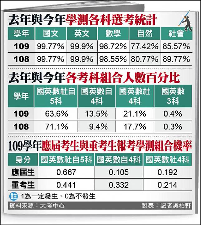 補教老師藍天予說,去年首度實施選考,但大學科系招生簡章公布比學測報名晚,學生不確定志願科系的參採情況,多選擇全考以防萬一,一○九學年校系參採提早公布,考生志願科系確定不會用到自然或社會,因此今年更多學生大膽直接放棄,但分數的五標上是否受影響則待觀察。