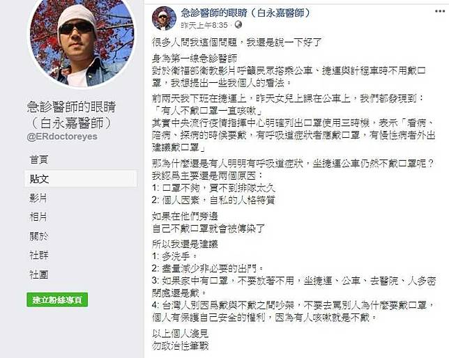 白永嘉指出,因為最近很多人詢問「搭乘大眾運輸」是否要戴口罩,身為第一線急診醫師的他,對於衛福部衛教影片,呼籲民眾搭乘公車、捷運與計程車時不用戴口罩,想提出一些個人看法;他表示,前兩天下班在捷運上,以及帶女兒上課的公車上,都有發現到「有人不戴口罩一直咳嗽」的問題。