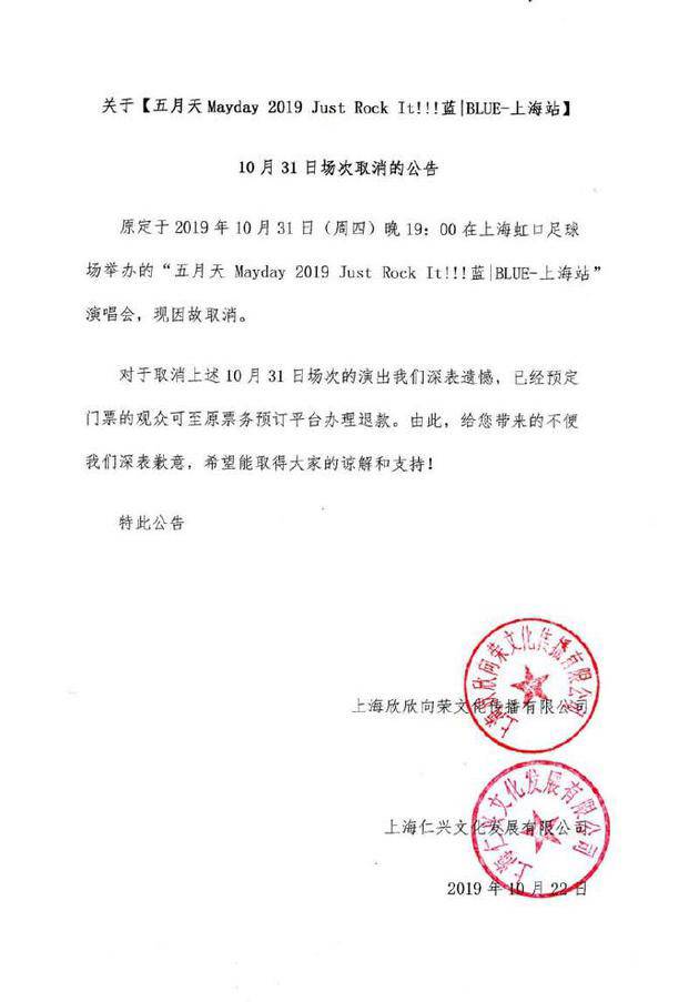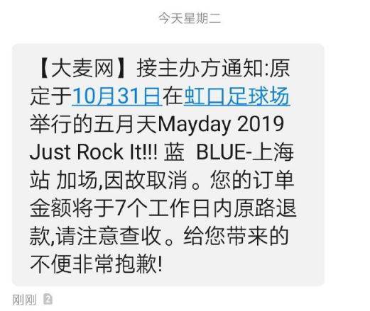 有粉絲今日上午10點於微博貼出被票務網站發簡訊通知五月天演唱會退款的截圖,隨後演唱會主辦單位發出公告,宣佈上海演唱會加場取消。「五月天上海演唱會加場取消」隨即登上熱搜,取消原因官方並未進一步說明,無預警被用「簡訊」告知讓粉絲相當錯愕。