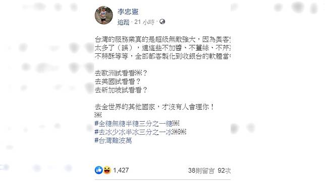 李忠憲感嘆,台灣的服務業真的是超級無敵強大,「因為奧客實在太多了(誤),連這些不加醬、不薑絲、不芹菜、不蒜酥等等,全部都客製化到收銀台的軟體當中!」他還提到飲料業的專業術語,「全糖、無糖、半糖、三分之一糖」、「去冰、少冰、半冰、三分之一冰」,直呼「去歐洲試看看?去美國試看看?去新加坡試看看?去全世界的其他國家,才沒有人會理你!」