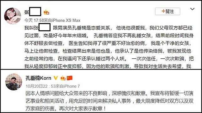 張女20日在微博曬出多張跟孔垂楠的照片,自稱跟對方是戀愛關係,並說兩人年底將結婚,然而,她日前感到身體不適去做檢查,「醫生告知我得了很嚴重不好治癒的病。我是個乾淨的女孩,馬上讓他做檢查,檢查結果出來他也是,他承認了是他傳染給我。」