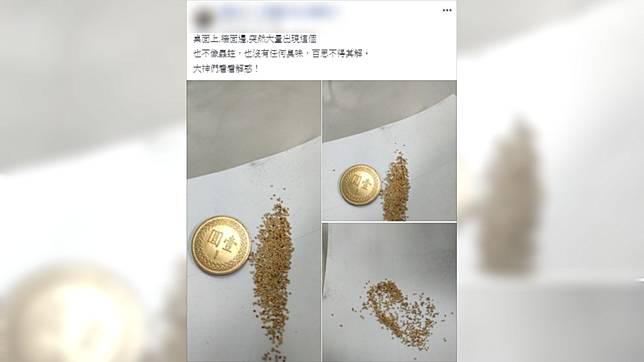 這名網友在臉書社團「爆廢公社公開版」分享幾張照片,寫道「桌面上、牆面邊,突然大量出現這個,也不像蟲蛀,也沒有任何臭味,百思不得其解。」只見照片中有一大陀像白芝麻的東西,其中有幾粒顏色比較深,一旁還放一枚1元硬幣作比例尺。