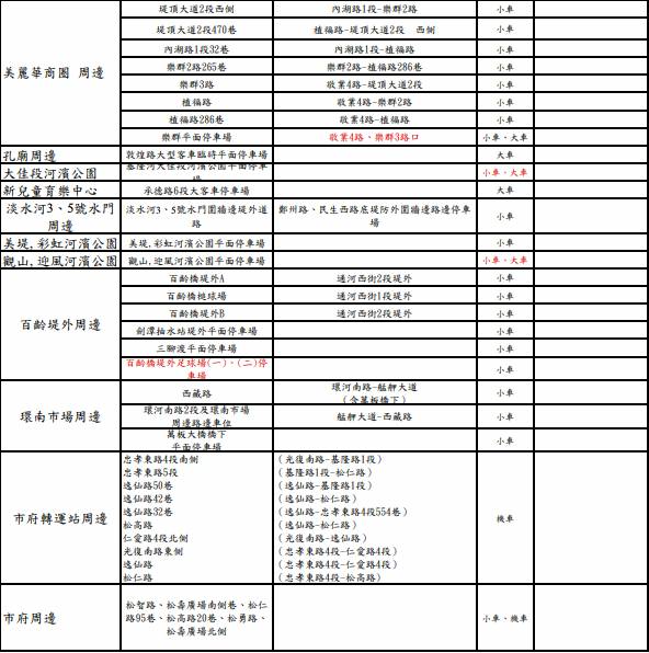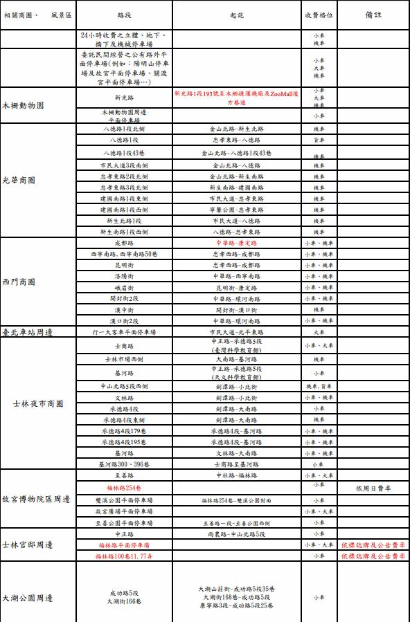 台北市政府表示,原週日收費之路邊停車格,如西門商圈、光華商圈、美麗華商圈、木柵動物園、士林觀光景點之周邊道路等,配合各商圈營運時間仍維持收費,未納入公告收費路邊停車格則暫停收費。