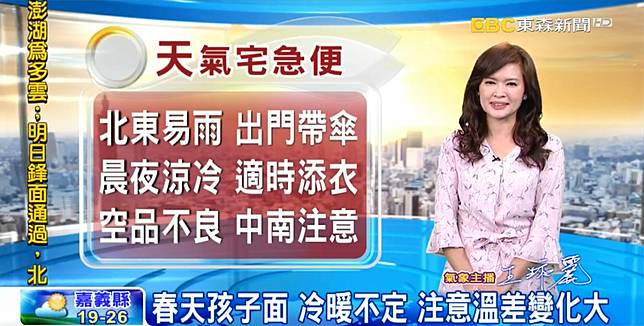 空氣品質部分,根據環保署空氣品質預報資訊,今日宜蘭、花東空品區及澎湖地區為「良好」等級;北部、竹苗、中部、雲嘉南、高屏空品區及馬祖、金門為「普通」等級,中南部清晨垂直擴散條件稍差,局部地區可能達橘色提醒等級。