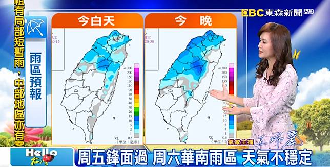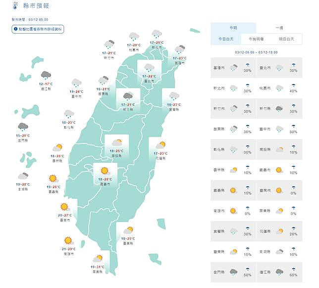明(13)日鋒面通過,中部以北、東半部地區及南部山區有局部短暫陣雨,南部平地為多雲,周六東北季風或大陸冷氣團南下,氣溫逐漸下降,愈晚愈冷,尤其北台灣降溫感受最明顯,華南雲雨區東移使得環境水氣偏多,北部、宜蘭有短暫雨,其他地區有局部短暫雨。