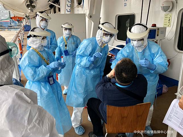 為了加速檢驗的速度,共有6名醫師和8名護理師分6線採檢,第一階段根據昨天設定的名單採檢68名,第二階段則有58名,另有2名隔離船員,所有人員非常配合作業順利。