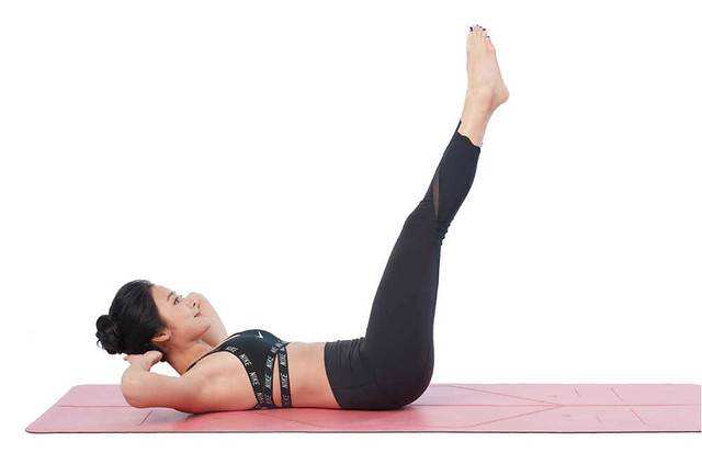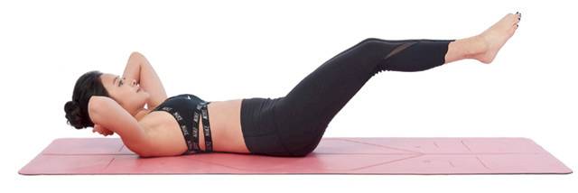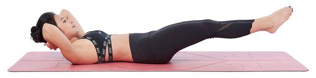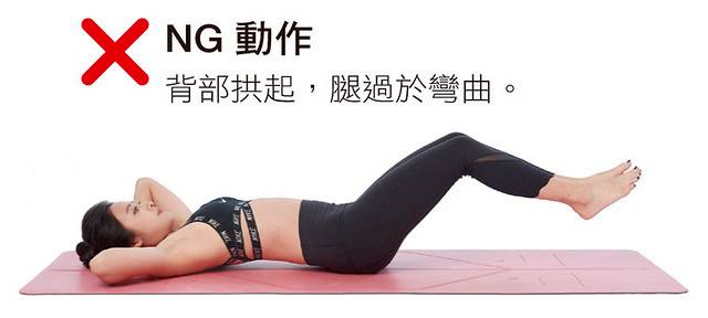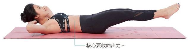 1 臥躺,手抱頭,雙腿稍微抬離地面。核心收緊,讓背部緊貼地板。