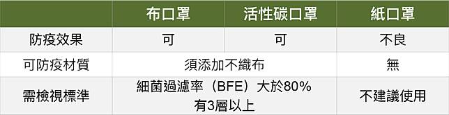 食藥署也建議,不論是具有防PM2.5、防霾功能或具有中間過濾層的布、活性碳口罩時,可由口罩包裝標示來確認挑選的產品是否合乎以下要訣:
