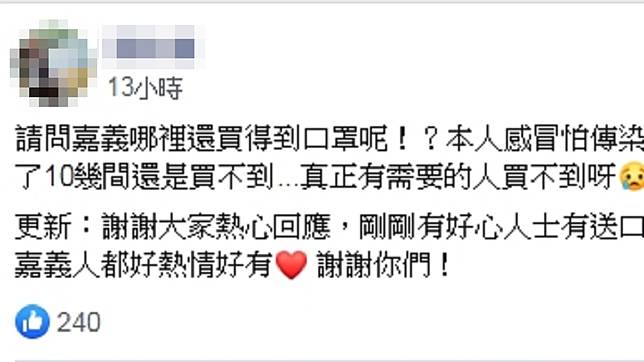 網友們踴躍留言,原PO媽媽也更新狀態表示,「謝謝大家熱心回應,剛剛有好心人士有送口罩給我們了!好感動嘉義人都好熱情好有心,謝謝你們!」