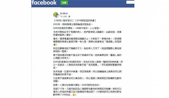 武漢肺炎疫情持續擴大!武漢市健委21日證實目前有218例確診,當地已有4名病例死亡,其中還有15名醫護人員被感染,台灣21日晚間也證實首例確診。有專家認為,武漢肺炎「肯定有人傳人現象」;對此,常在粉專《Dr. Bird》分享泌尿衛教知識的「鳥博士」,也在分享2003年SARS疫情爆發時人心惶惶的場景,直言「SARS真的超可怕」。