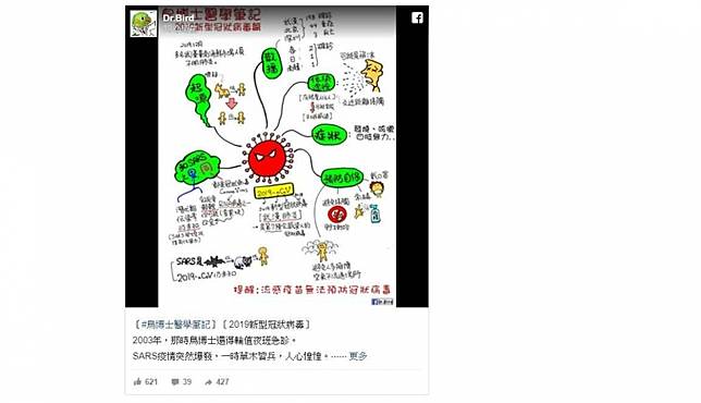 至於要如何防治?「鳥博士」除了Po出一張圖文並茂的解說圖,讓外界更了解武漢肺炎,還提醒民眾出入公眾場合時,最好戴著口罩;若要觸碰別人摸過的物品,像是捷運把手或電梯按鈕等,建議使用酒精或消毒液。