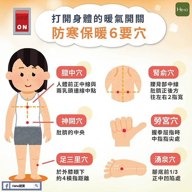 許多人天氣冷就容易手腳冰冷,即使穿再多衣服、貼暖暖包,身體還是暖不起來,這可能是因為身體的氣血循環不好,所以身體的能量不足以供應到四肢末梢。如果你也是這類型的人,那麼以下要來告訴你身體的6個暖氣開關,只要按摩這些穴道,就可以促進氣血循環讓身體熱起來,還可以增強免疫力哦!