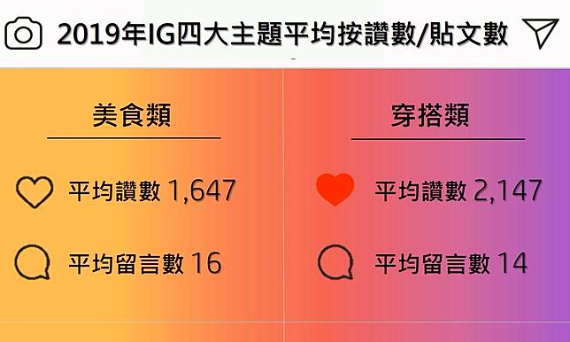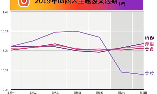 四大主題中,美食、旅遊、穿搭類的貼文發文週期較平均,而美妝類貼文則有明顯集中在平日的趨勢,推測可能的原因是美妝主題有較多的合作行銷貼文。在貼文的表現上,穿搭類貼文有明顯高出其他主題的讚數;而在討論度上,各主題的表現差異不大。