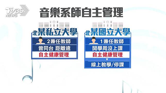 一天兩次追蹤電話,團員狀況都還穩定但不少人身兼師職,北部某私立大學,有兩名兼任教師,曾和澳洲音樂家同台,但距離較遠,只需自主管理,另外一間國立大學,也有一名老師,慶幸開學周沒上課,目前在家休息,未來不排除停課或改線上教學。