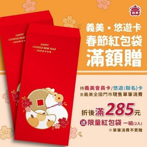 即日起持義美會員卡/悠遊卡/悠遊聯名卡,至全國義美門市單筆消費折後滿285元,即贈送限量春節紅包袋一份。