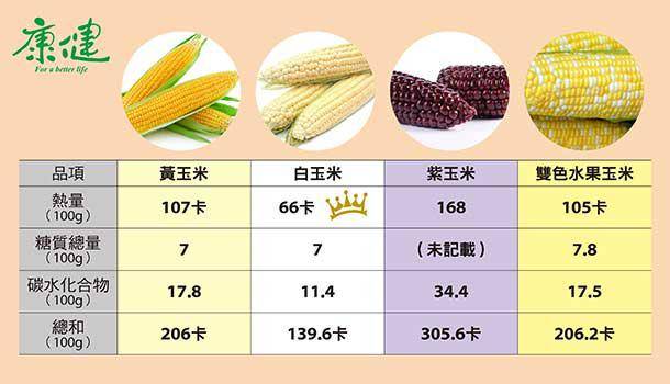 許多人用白玉米來減重,原因是抗性澱粉高且熱量低。根據食藥署的食品營養資料庫的數據顯示,以常見黃、白、紫、雙色玉米的熱量來看,白玉米的熱量的確是最低的: