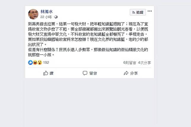 林濁水酸韓「但是有什麼關係?庶民永遠人多勢眾,哪像假仙知識的、假仙精緻文化的就那麼一小撮。」