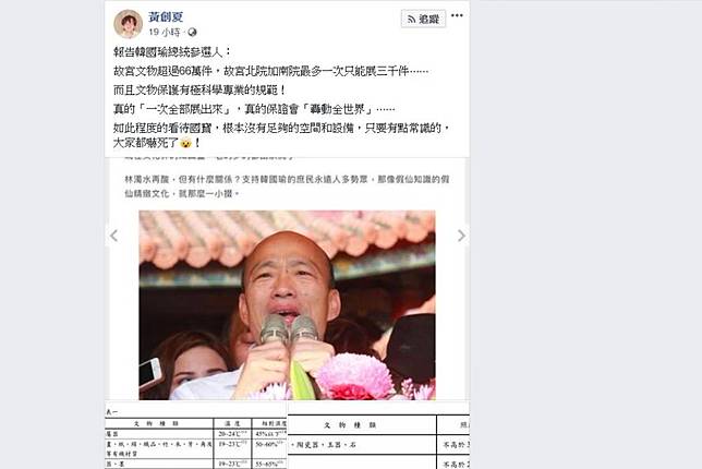 另外,資深媒體人黃創夏也在臉書表示,故宮文物超過66萬件,故宮北院嘉南院最多一次展出3000件,而且文物保護極有科學專業的規範,如果真的一次展出來,保證會「轟動全世界」。如此程度地看待國寳,根本沒有足夠的空間和設備,只要有點常識的,大家都嚇死了。