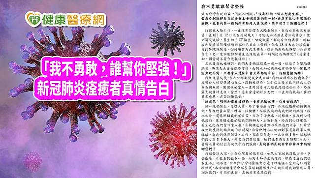 【健康醫療網/編輯部整理】如果要我用一句話來形容出院的心情,那我會這麼說:「我不勇敢誰幫你堅強!」中央流行疫情指揮中心13日宣布,國內第10例新型冠狀病毒確診個案臨床症狀改善、三套採檢皆呈現陰性,目前恢復狀況良好,經由專家會議評估後,最快今日可解除隔離限制,可望於近日內出院。
