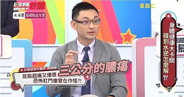 張振榕心想「絕對不是痔瘡」,檢查一看比上次更慘,「肛門已經有一塊3公分膿瘍,它已經爆膿了,整個流湯流膿出來!」張振榕表示,男子膿包上面已經出現了2、3個破口,肛門膿瘍與廔管已經打通,只好對他說:「這個我已經沒辦法,吃抗生素也不會好。」最後男子才肯乖乖接受手術治療。